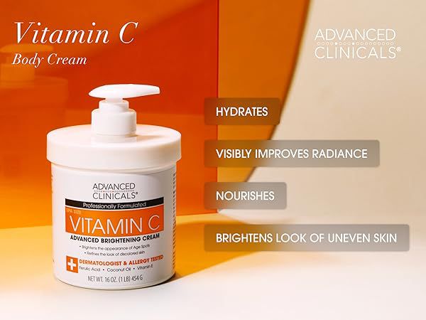 This Vitamin C Body Cream, infused with Ferulic Acid, Vitamin E, and Coconut Oil, visibly brightens and improves the look of uneven skin tone, reducing the appearance of dark spots and dull, uneven-looking skin. The rich, velvety cream melts into the skin to hydrate and restore softness.